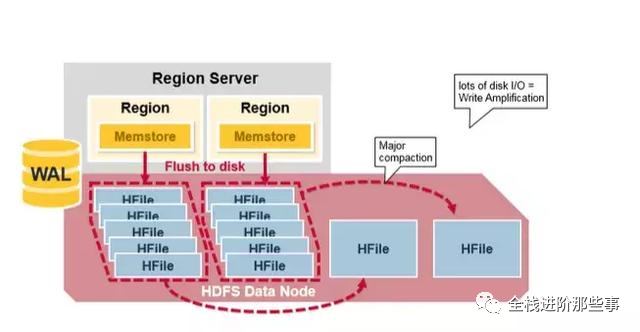 Major Compaction 合并重写每个 Column Family 下的所有的 HFiles,成为一个单独的大 HFile,在这个过程中,被删除的和过期的 cell 会被真正从物理上删除,这能提高读的性能。但是因为 major compaction 会重写所有的 HFile,会产生大量的硬盘 I/O 和网络开销。这被称为写放大(Write Amplification)。