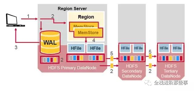 所有的读写都发生在 HDFS 的主 DataNode 节点上。HDFS 会自动备份 WAL 和 HFile 的文件 blocks。HBase 依赖于 HDFS 来保证数据完整安全。当数据被写入 HDFS 时,一份会写入本地节点,另外两个备份会被写入其它节点。