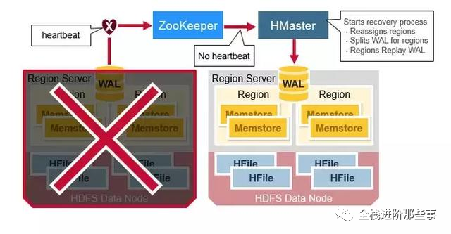 当 HMaster 发现某个 region server 故障,HMaster 会将这个 region server 所管理的 regions 分配给其它健康的 region servers。为了恢复故障的 region server 的 MemStore 中还未被持久化到 HFile 的数据,HMaster 会将 WAL 分割成几个文件,将它们保存在新的 region server 上。每个 region server 然后回放各自拿到的 WAL 碎片中的数据,来为它所分配到的新 region 建立 MemStore。