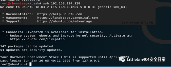 在攻击机使用ssh免密登录主机A:ssh -i id_rsa root@192.168.114.128,成功登录: