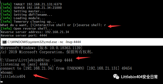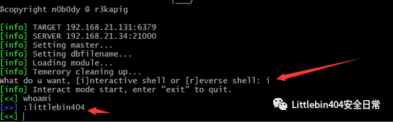 分为Interactive shell和 Reverse shell,输入选项i,运行whoami: