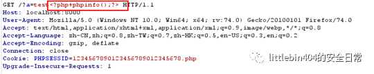 注:PHPSESSID的值一定满足32位(包括.php),接着再通过变量a传递任意代码;