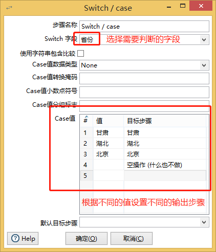 这个控件就是提供switch分支流程控制的能力,通过该控件可以设置对数据流中的字段进行判断后运行不同的转换步骤。