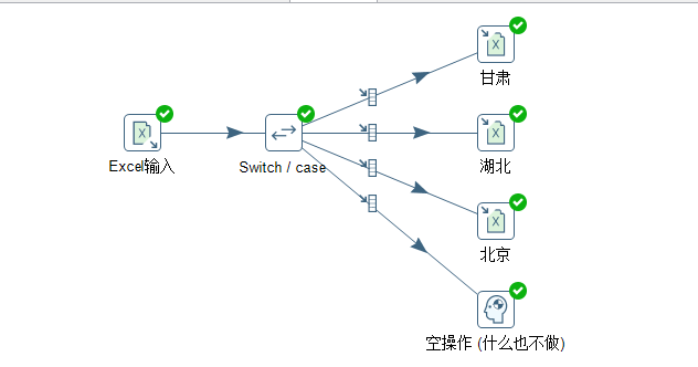 首先通过excel输入控件获得要转换的数据,然后通过swith流程控件进行控制,按照省份字段不同走不同的执行流程,最终生成不同名称的文件。