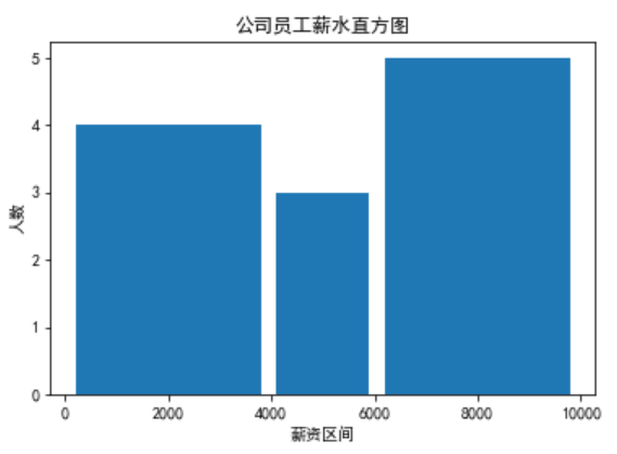 由于bins的取值是左闭右开,统计salary中[0, 4000)的个数为4,[4000, 6000)的个数为3,[6000, 10000)的个数为5。