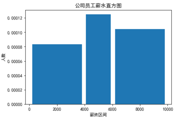 #density的值Trueimport numpy as npimport pandas as pdfrom scipy import statsfrom matplotlib.pyplot import *import matplotlib.pyplot as pltplt.rcParams['font.sans-serif'] = ['SimHei'] # 解决标题中文显示问题plt.rcParams['axes.unicode_minus'] = False # 解决标题中文显示问题salary = [2500, 3100, 3300, 3500, 4000, 5400, 5600, 6700, 7600, 7800, 8700, 9800, 10400]#公司员工薪资数据fig = plt.figure()ax = fig.add_subplot(111)#创建图形numBins = [0,4000,6000,10000]#直方图的分割区间ax.hist(salary, numBins, rwidth=0.9, density=True)plt.title(u'公司员工薪水直方图')#绘制标题plt.xlabel(u'薪资区间')#横坐标标题plt.ylabel(u'人数')#纵坐标标题plt.show()