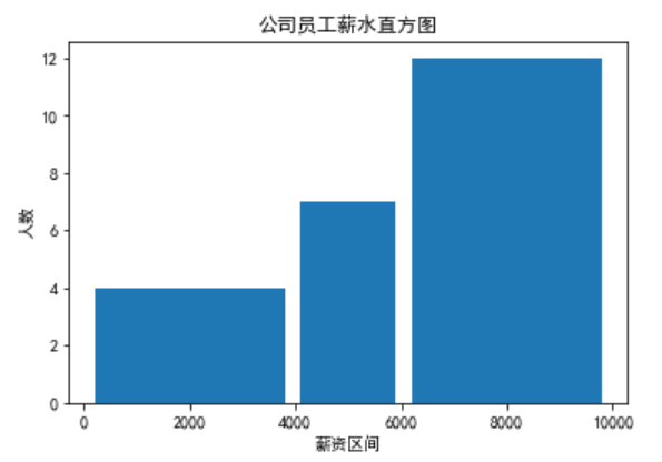 #rwidth参数理解import numpy as npimport pandas as pdfrom scipy import statsfrom matplotlib.pyplot import *import matplotlib.pyplot as pltplt.rcParams['font.sans-serif'] = ['SimHei'] # 解决标题中文显示问题plt.rcParams['axes.unicode_minus'] = False # 解决标题中文显示问题salary = [2500, 3100, 3300, 3500, 4000, 5400, 5600, 6700, 7600, 7800, 8700, 9800, 10400]#公司员工薪资数据fig = plt.figure()ax = fig.add_subplot(111)#创建图形numBins = [0,4000,6000,10000]#直方图的分割区间ax.hist(salary, numBins, rwidth=0.9)plt.title(u'公司员工薪水直方图')#绘制标题plt.xlabel(u'薪资区间')#横坐标标题plt.ylabel(u'人数')#纵坐标标题plt.show()