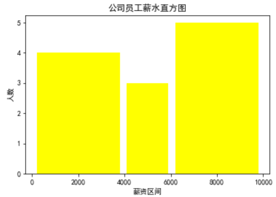 #cumulative的值Trueimport numpy as npimport pandas as pdfrom scipy import statsfrom matplotlib.pyplot import *import matplotlib.pyplot as pltplt.rcParams['font.sans-serif'] = ['SimHei'] # 解决标题中文显示问题plt.rcParams['axes.unicode_minus'] = False # 解决标题中文显示问题salary = [2500, 3100, 3300, 3500, 4000, 5400, 5600, 6700, 7600, 7800, 8700, 9800, 10400]#公司员工薪资数据fig = plt.figure()ax = fig.add_subplot(111)#创建图形numBins = [0,4000,6000,10000]#直方图的分割区间ax.hist(salary, numBins, rwidth=0.9, color='yellow')plt.title(u'公司员工薪水直方图')#绘制标题plt.xlabel(u'薪资区间')#横坐标标题plt.ylabel(u'人数')#纵坐标标题plt.show()