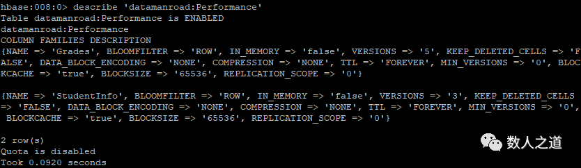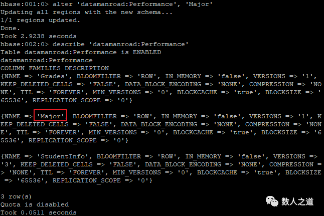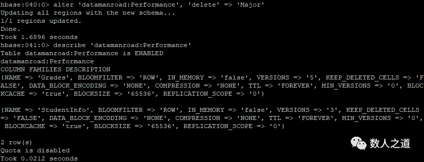下面会有使用 alter 命令修改列族信息、删除列族的介绍。