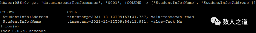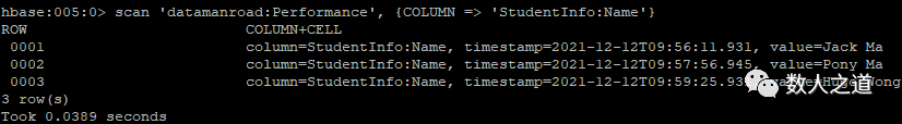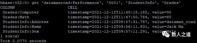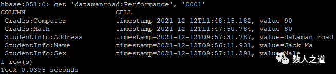 hbase:026:0> put 'datamanroad:Performance', '0001', 'StudentInfo:Name', 'Jack Ma'