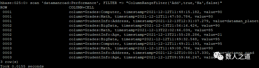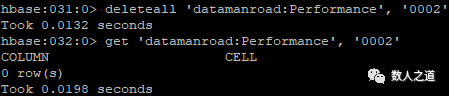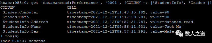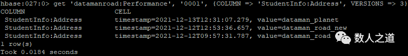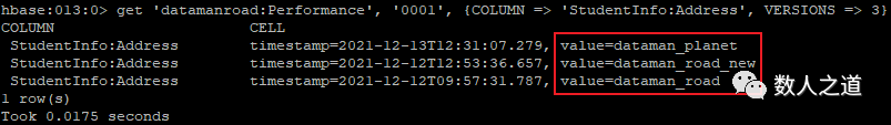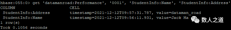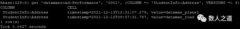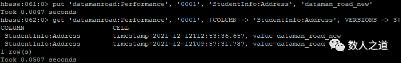 hbase:035:0> put 'datamanroad:Performance', '0003', 'StudentInfo:Address', 'dataman_road'