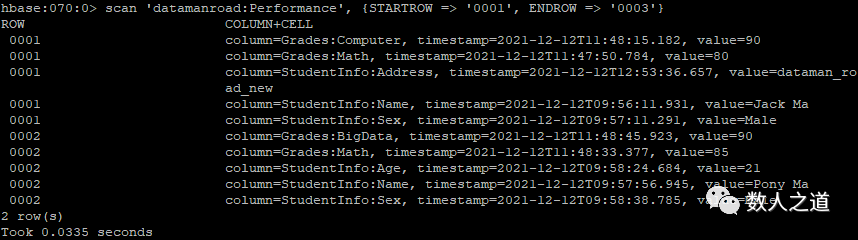 hbase:030:0> put 'datamanroad:Performance', '0002', 'StudentInfo:Age', '21'