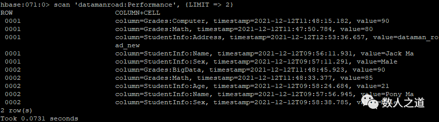 hbase:046:0> put 'datamanroad:Performance', '0002', 'Grades:Math', '85'