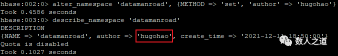 create_namespace 'datamanroad', {'author' => 'hugowong', 'create_time' => '2021-12-11 18:50:00'}