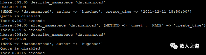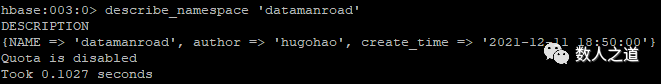 创建表时若不指定命名空间,默认挂在 default 这个命名空间下。这里我们新建一个 namespace: datamanroad, 在这个命名空间下进行操作,创建命名空间的时候还可以添加一些说明信息: