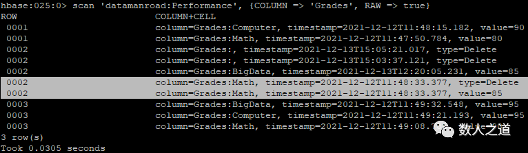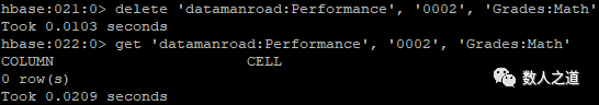 hbase:050:0> put 'datamanroad:Performance', '0003', 'Grades:BigData', '95'