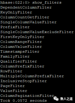 使用 show_filters 命令可以查看当前 HBase 支持的过滤器类型: