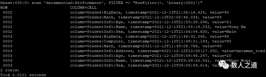scan 'datamanroad:Performance', FILTER => "RowFilter(>, 'binary:0001')"