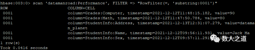 scan 'datamanroad:Performance', FILTER => "RowFilter(=, 'substring:0001')"