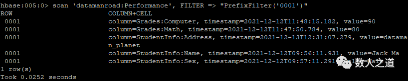 scan 'datamanroad:Performance', FILTER => "PrefixFilter('0001')"