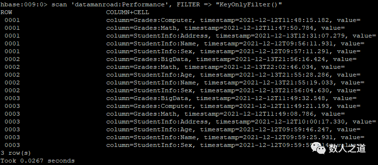scan 'datamanroad:Performance', FILTER => "KeyOnlyFilter()"