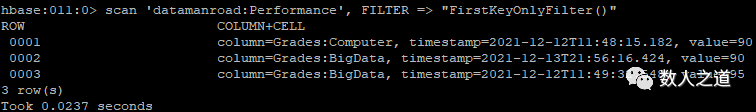 scan 'datamanroad:Performance', FILTER => "FirstKeyOnlyFilter()"