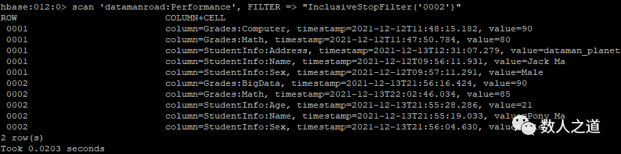scan 'datamanroad:Performance', FILTER => "InclusiveStopFilter('0002')"