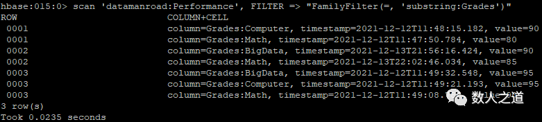 scan 'datamanroad:Performance', FILTER => "FamilyFilter(=, 'substring:Grades')"
