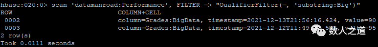 scan 'datamanroad:Performance', FILTER => "QualifierFilter(=, 'substring:Big')"
