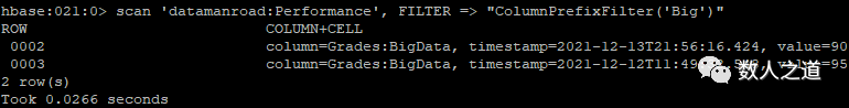 此过滤命令跟上面的 RowFilter 过滤器加 substring 比较器命令效果是一样的,只是 PrefixFilter 过滤器无需结合比较运算符及比较器即可完成过滤,更加方便快捷。