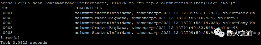 scan 'datamanroad:Performance', FILTER => "ColumnPrefixFilter('Big')"
