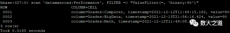 scan 'datamanroad:Performance', FILTER => "ValueFilter(=, 'binary:90')"