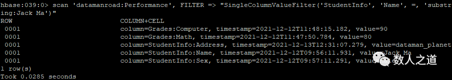 scan 'datamanroad:Performance', FILTER => "SingleColumnValueFilter('StudentInfo', 'Name', =, 'substring:Jack Ma')"