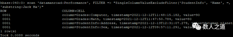 scan 'datamanroad:Performance', FILTER => "SingleColumnValueExcludeFilter('StudentInfo', 'Name', =, 'substring:Jack Ma')"