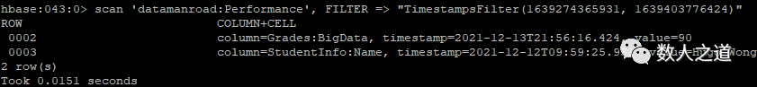 scan 'datamanroad:Performance', FILTER => "TimestampsFilter(1639274365931, 1639403776424)"