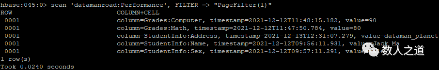 scan 'datamanroad:Performance', FILTER => "PageFilter(1)"