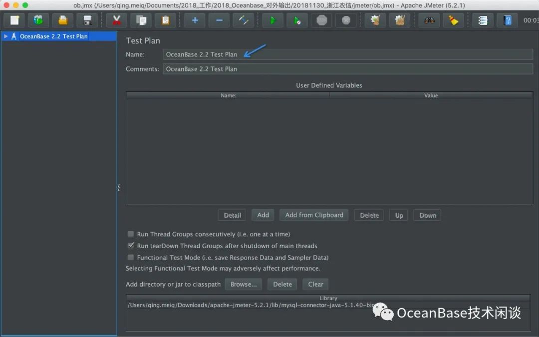 使用JMeter测试OceanBase性能的时候也需要加载OceanBase的Java驱动。文件可以从官网的下载文件中获取,或者从这个途径:https://github.com/obpilot/benchmarksql-5.0/blob/master/lib/oracle/oceanbase-client-1.0.9.jar