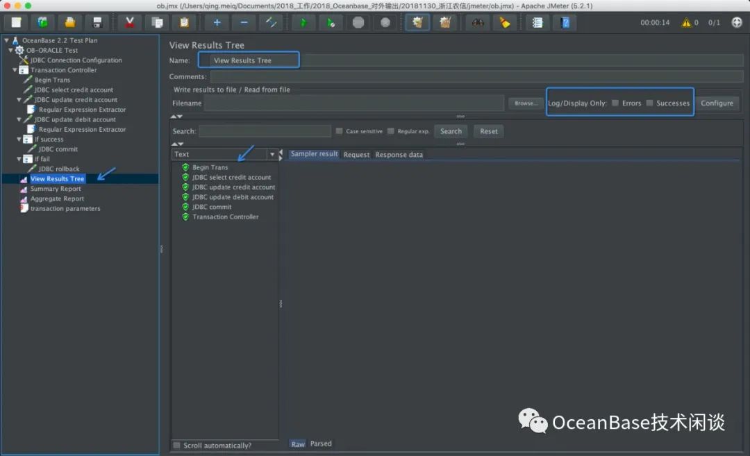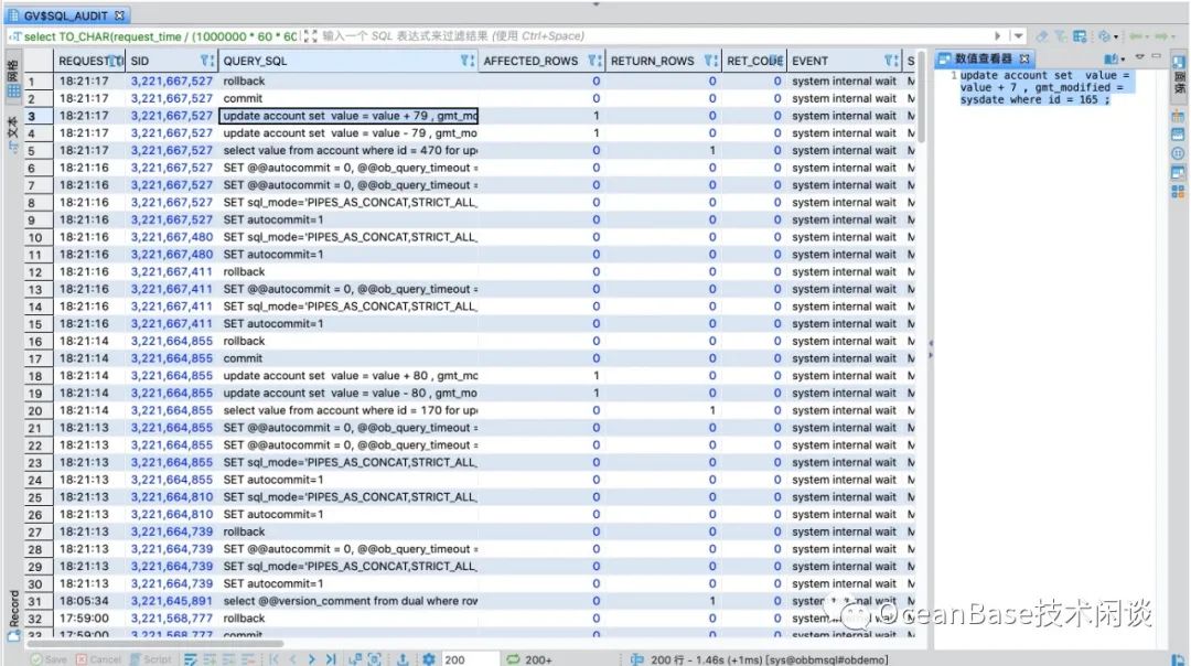 用户下,利用OceanBase的SQL审计功能可以查看JMeter发出的测试SQL细节。在这个里面可以看到SQL的执行细节(错误码、耗时、等待事件之类),对分析性能结果非常有帮助。
