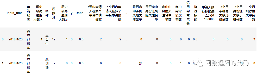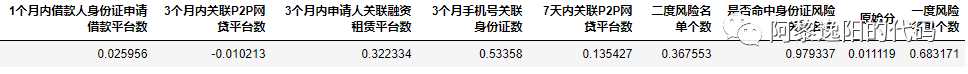 columns_x =['7天内申请人在多个平台申请借款','1个月内申请人在多个平台申请借款','3个月内申请人在多个平台申请借款','7天内借款人手机申请借款平台数','1个月内借款人手机申请借款平台数','3个月内借款人手机申请借款平台数','7天内借款人身份证申请借款平台数','1个月内借款人身份证申请借款平台数','3个月内借款人身份证申请借款平台数','7天内关联P2P网贷平台数','1个月内关联P2P网贷平台数','3个月内关联P2P网贷平台数','7天内申请人关联融资租赁平台数','1个月内申请人关联融资租赁平台数','3个月内申请人关联融资租赁平台数','1个月内申请人关联一般消费分期平台数','3个月内申请人关联一般消费分期平台数','风险名单占比','一度关联节点个数','二度关联节点个数','一度风险名单个数','二度风险名单个数','一度风险名单占比','二度风险名单占比','X3个月内申请人手机号作为第二联系人手机号出现的次数','X3个月内申请人手机号作为前三联系人手机号出现的次数','是否命中法院执行模糊名单','是否命中法院结案模糊名单','是否命中手机风险关注名单','是否命中身份证风险关注名单','命中中风险关注名单笔数','客户异常借款笔数','信用异常笔数','执行标的','申请人执行标的是否超过100000','3个月手机号关联身份证数','3个月身份证关联手机号数','三个月银行相关平台数'] #自变量名称X = data[columns_x] #生成自变量数据框Y = data['y'] #生成因变量y