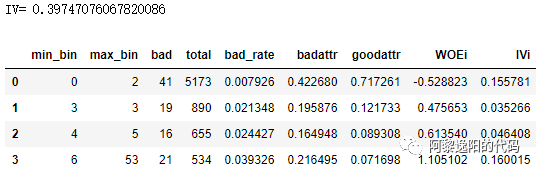 ivs=[]for i in columns_x:print(i)IV,cut,WOEi,d4 = bin_frequency(X[i], Y)print('IV=', IV)ivs.append(IV)print(d4)