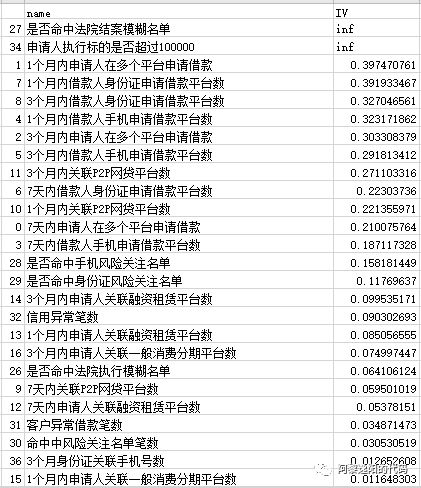 IVi=pd.DataFrame({'name':columns_x, 'IV':ivs}).sort_values('IV',ascending = False)IVi.to_csv("IV.csv")