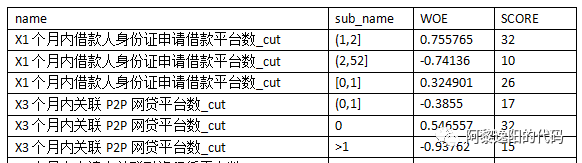 把变量转成woe后,可以根据分箱情况和逻辑回归的结果,通过转换把变量变成评分卡的形式: