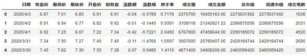 import osimport pandas as pdos.chdir(r'F:\公众号\6.学习python') #设置成存放数据文件夹路径date = pd.read_csv("股票数据.csv", encoding = 'GBK') #读取数据