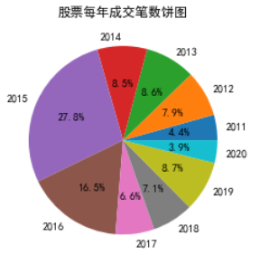import matplotlib.pyplot as plt #导入绘图包plt.rcParams['font.sans-serif'] = ['SimHei'] #解决中文显示问题plt.rcParams['axes.unicode_minus'] = False # 解决中文显示问题date = date.set_index('日期') #把日期列设为索引date.index = pd.to_datetime(date.index) #把索引转为时间格式result = date[['成交笔数']].groupby(date.index.year).sum() #按年总计股票成交笔数plt.pie(result['成交笔数'], labels=result.index, autopct='%3.1f%%') #以时间为标签,总计成交笔数为数据绘制饼图,并显示3位整数一位小数plt.title('股票每年成交笔数饼图') #加标题plt.show()