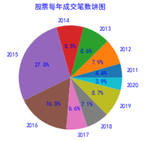 plt.pie(result['成交笔数'], labels=result.index, autopct='%3.1f%%', textprops={'color':'b', 'size':10, 'weight':'bold'}) #设置显示字体颜色、尺寸、加粗plt.title('股票每年成交笔数饼图', c='b') #加标题plt.show()