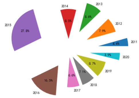 result = date.groupby(date.index.year).agg(sum=('成交笔数', 'sum'), avg=('换手率', 'mean')) #计算每年成交笔数总计值,换手率均值plt.pie(result['sum'], explode=result['avg']/result['avg'].max(), labels=result.index, autopct='%3.1f%%') #以成交笔数总计值为数值,标准化换手率为离心值绘制饼状图plt.show()