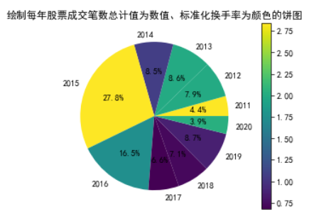import matplotlib.cm as cm #导入库result = date.groupby(date.index.year).agg(sum=('成交笔数', 'sum'), avg=('换手率', 'mean')) #计算每年成交笔数总计值,换手率均值plt.pie(result['sum'], colors=cm.ScalarMappable().to_rgba(result['avg']), labels=result.index, autopct='%3.1f%%') #根据换手率均值设置颜色绘制饼图plt.title('绘制每年股票成交笔数总计值为数值、标准化换手率为颜色的饼图') #设置标题sm = plt.cm.ScalarMappable(norm=plt.Normalize(vmin=result['avg'].min(), vmax=result['avg'].max()))plt.colorbar(sm) #根据换手率均值的从小到大显示颜色plt.show()