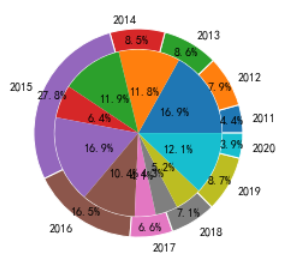 result = date.groupby(date.index.year).agg(sum=('成交笔数', 'sum'), avg=('换手率', 'mean')) #计算每年成交笔数总计值,换手率均值plt.pie(result['sum'], pctdistance=0.9, wedgeprops={'width':0.2, 'edgecolor':'w'}, labels=result.index, autopct='%3.1f%%') #绘制外圈plt.pie(result['avg'], pctdistance=0.5, radius=0.8, autopct='%3.1f%%') #绘制内圈plt.show()