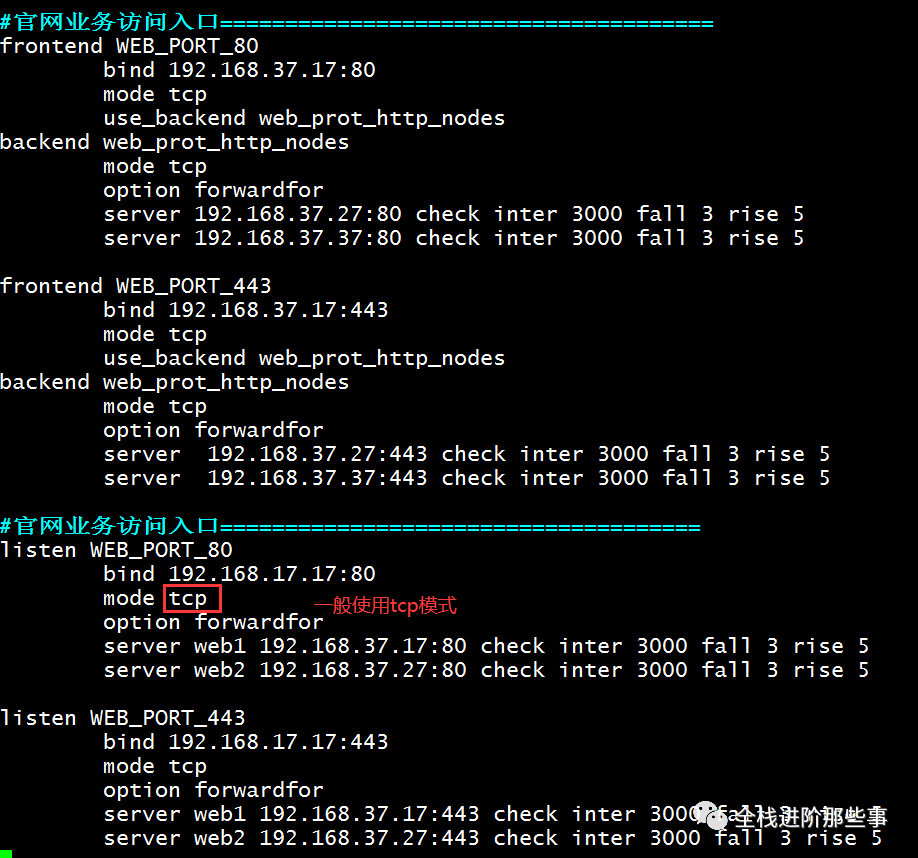#官网业务访问入口======================================frontend WEB_PORT_80bind 192.168.37.17:80mode tcpuse_backend web_prot_http_nodesbackend web_prot_http_nodesmode httpoption forwardforserver 192.168.37.27:80 check inter 3000 fall 3 rise 5server 192.168.37.37:80 check inter 3000 fall 3 rise 5frontend WEB_PORT_443bind 192.168.37.17:443mode tcpuse_backend web_prot_http_nodesbackend web_prot_http_nodesmode httpoption forwardforserver 192.168.37.27:443 check inter 3000 fall 3 rise 5server 192.168.37.37:443 check inter 3000 fall 3 rise 5#官网业务访问入口=====================================listen WEB_PORT_80bind 192.168.37.17:80mode tcpoption forwardforserver web1 192.168.37.17:80 check inter 3000 fall 3 rise 5server web2 192.168.37.27:80 check inter 3000 fall 3 rise 5listen WEB_PORT_443bind 192.168.37.17:443mode tcpoption forwardforserver web1 192.168.37.27:443 check inter 3000 fall 3 rise 5server web2 192.168.37.37:443 check inter 3000 fall 3 rise 5