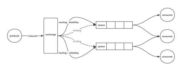 消息被发送到交换器上,然后交换器根据路由键规则决定发送到哪些绑定的队列。